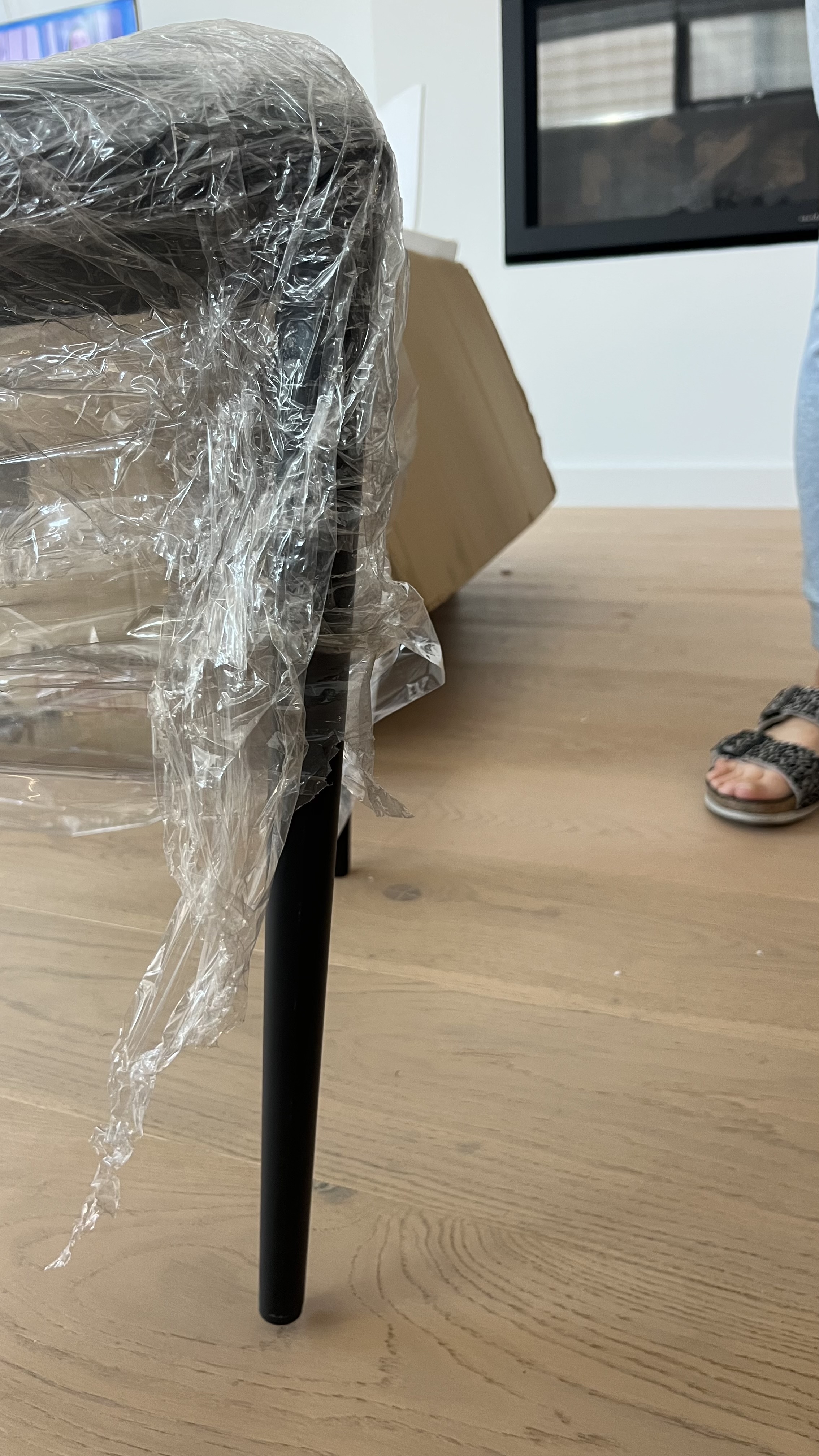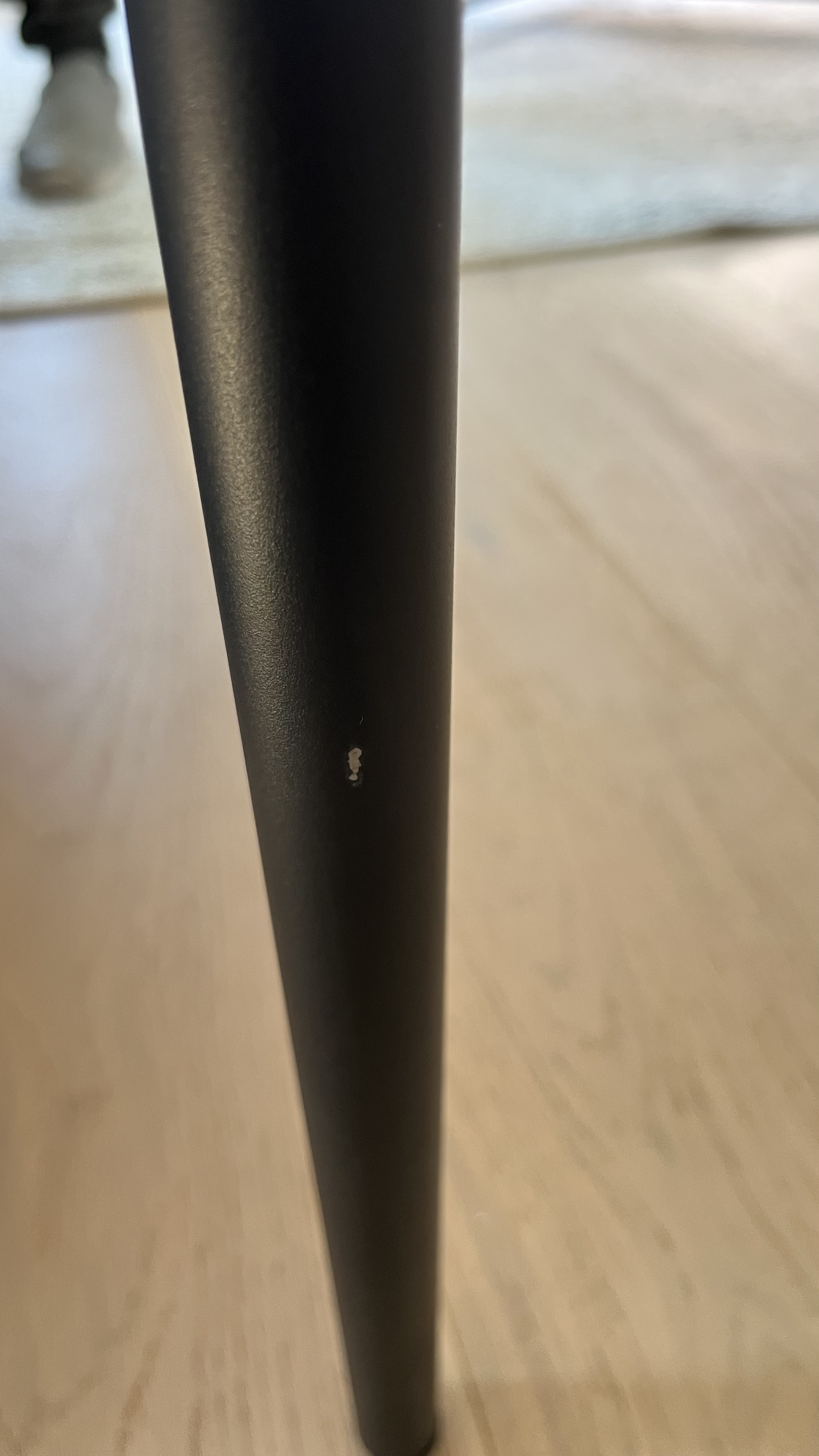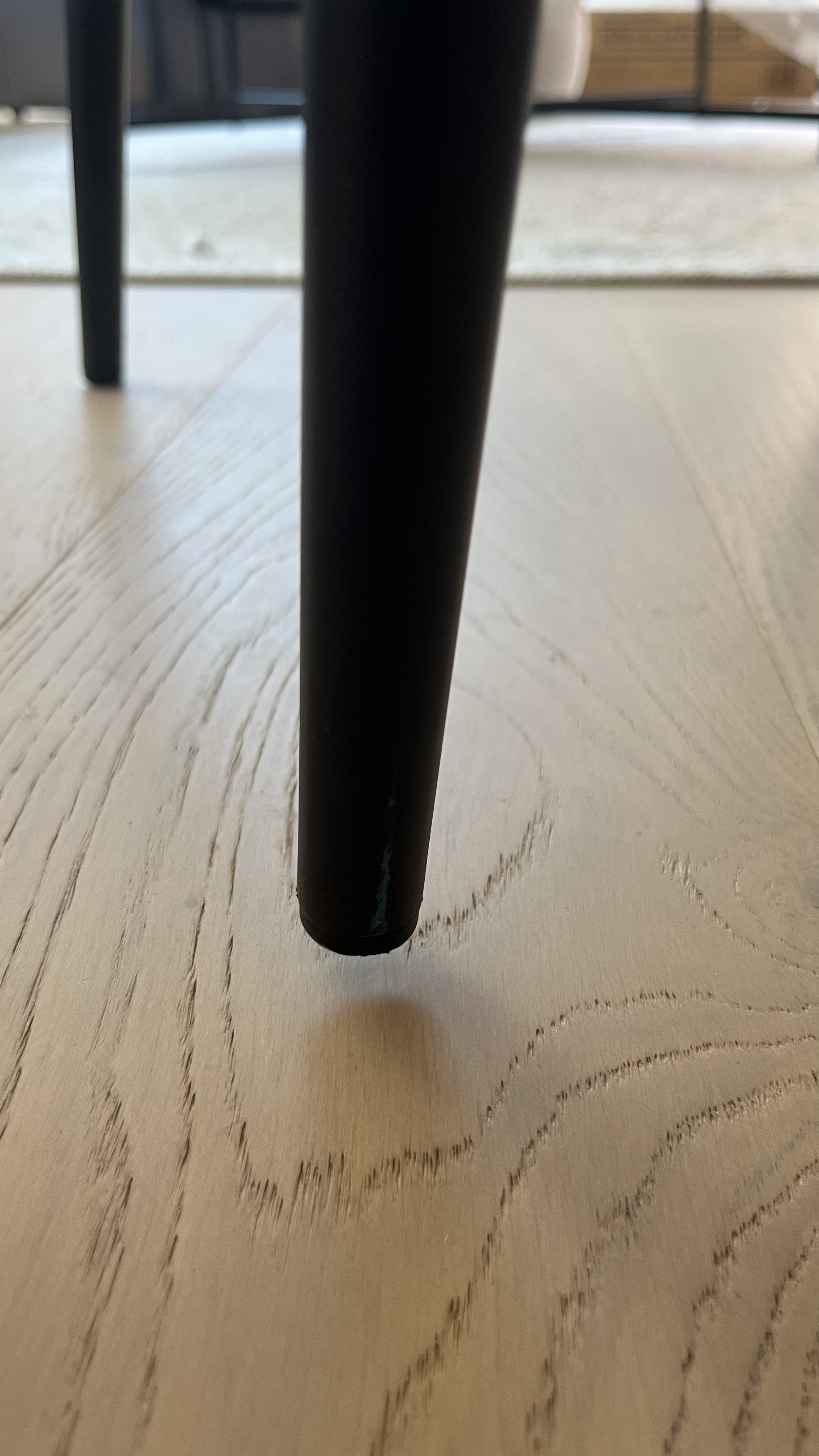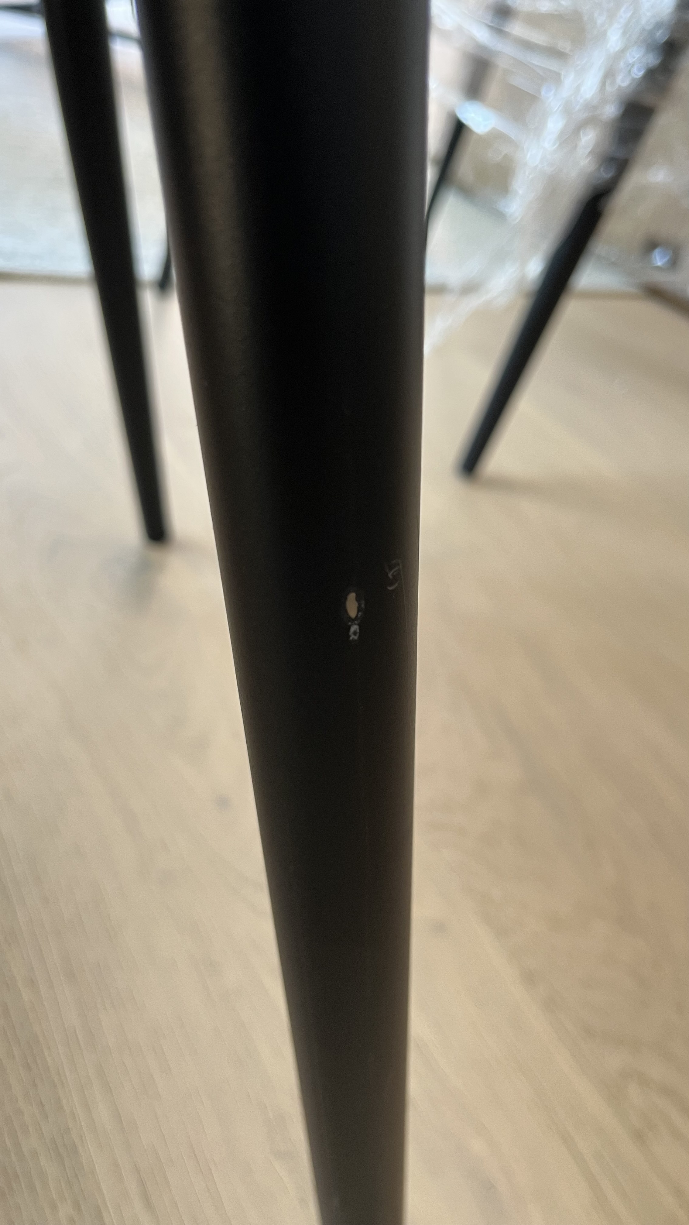 Three of the chairs were damaged. The leg of the first one was bent and had paint chips. Second chair also had the paint chips and scratches. The leather on the third one was also damaged. Pictures attached for reference.